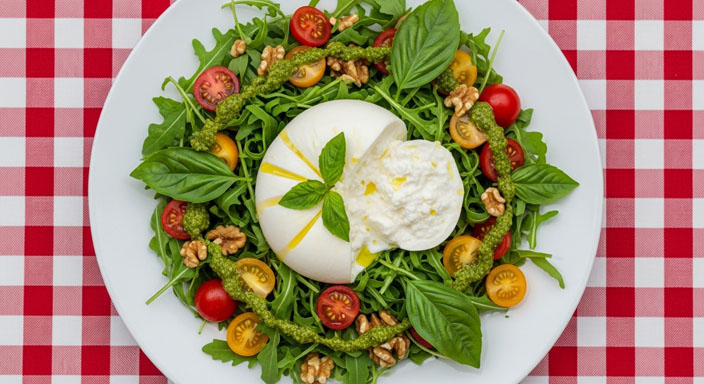 Burrata Cheese + Rocca + Cherry Tomatoes + Pesto sauce + Walnuts + Basil