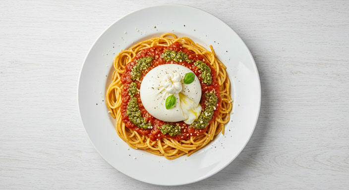 Red Sauce + Burrata cheese + Pesto + Parmesan cheese