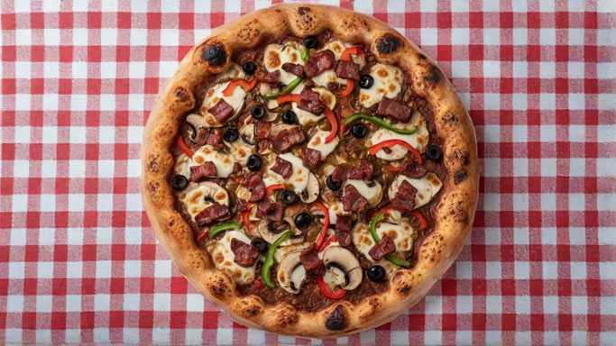 Brown sauce + Beef Bacon + Mozzarella + Bufala Mozzarella + Parmesan + Mushroom + Bell Pepper + Olives