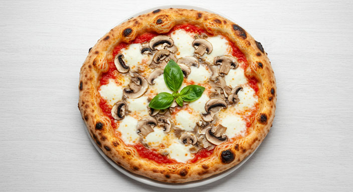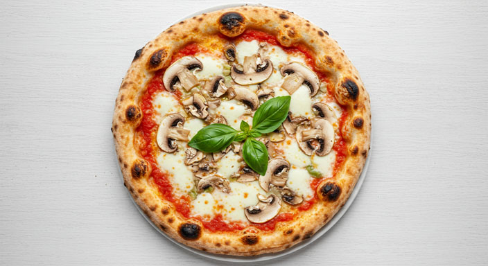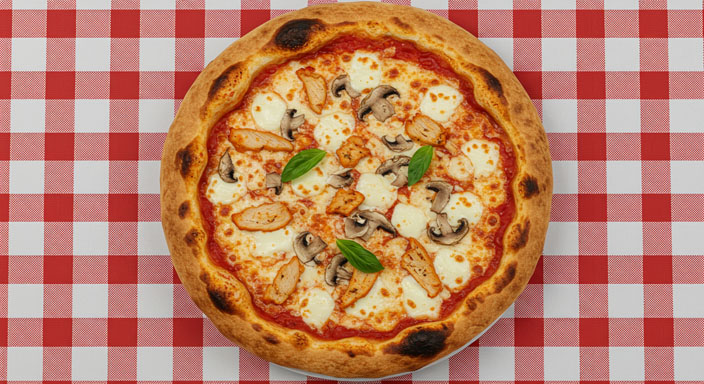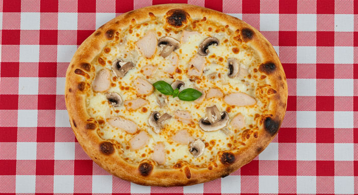 صلصة بيتزا الايطالية + فراخ + جبنة موزريلا بوفالا الايطالية + مشروم + بارميزان + زعتر