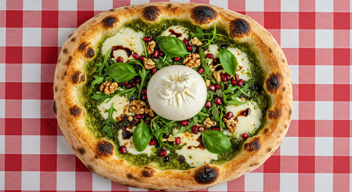 صلصة طماطم + جبنة بوراتا + بيستو + جبنة بارميزان