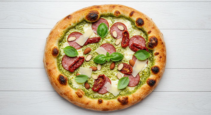 صوص بيستو + موزريلا بوفالا الايطالية + بارميجان + طماطم مجففة + ببروني + ريحان