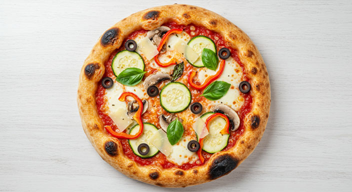 صلصه بيتزا الايطالية + جبنة موزريلا + جبنة موزريلا بوفالا الايطالية + فلفل الوان + كوسا + زيتون + مشروم + بارميزان